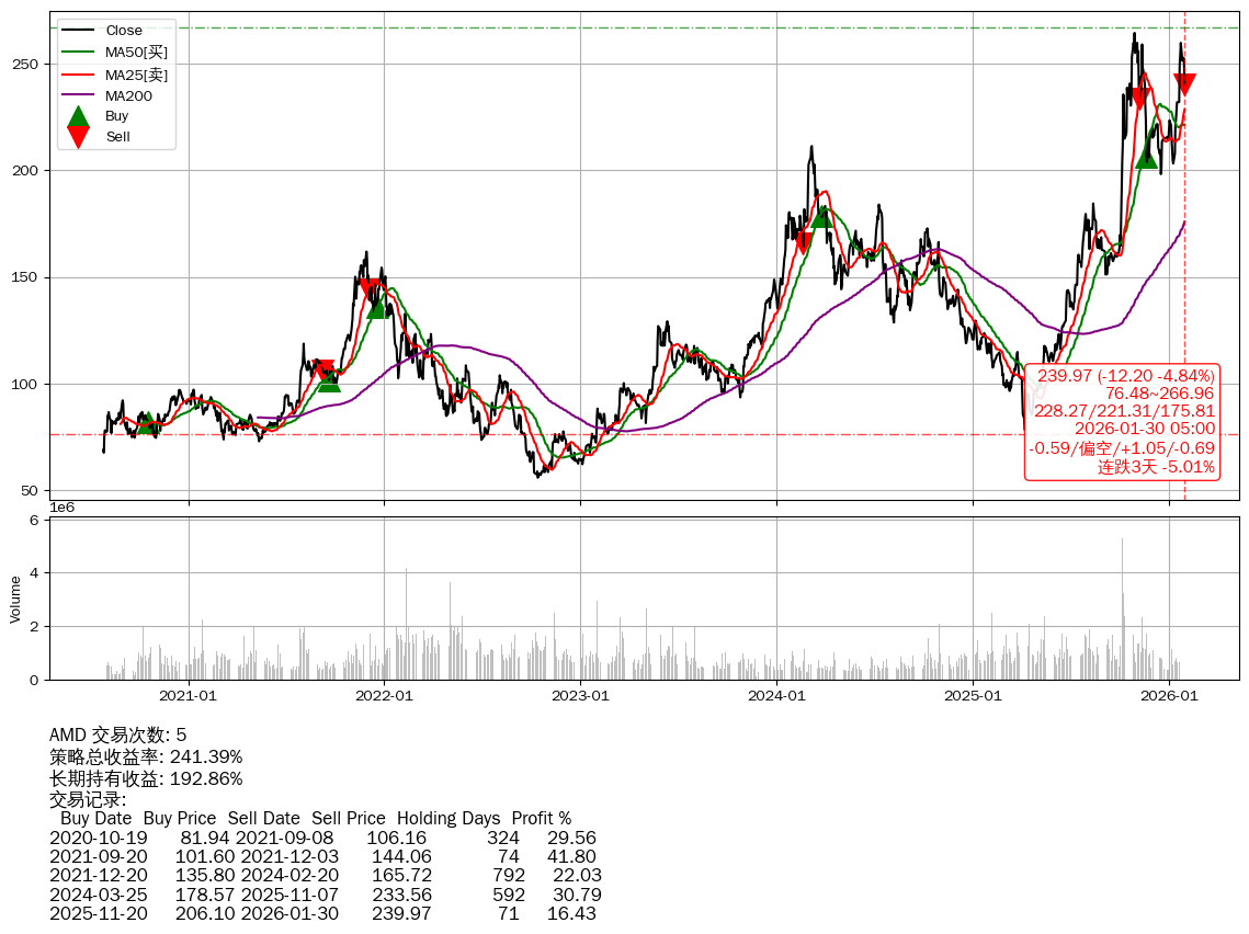 | 11 | ★AMD | $236.78(-15.31 -6.07%) 01-30 14:59 252.09 01-29 | 📉跌破 MA5/10 均线 📉连跌3天 -5.01% 📉回撤 2025-10-29 -9.21% (92天) 264.31(2025-10-28)→198.20(2025-12-16) | +241.39% | +192.86% | +48.53% | 5 | 偏空/1.05/-0.69 | 2020-07-27~2026-01-30 |