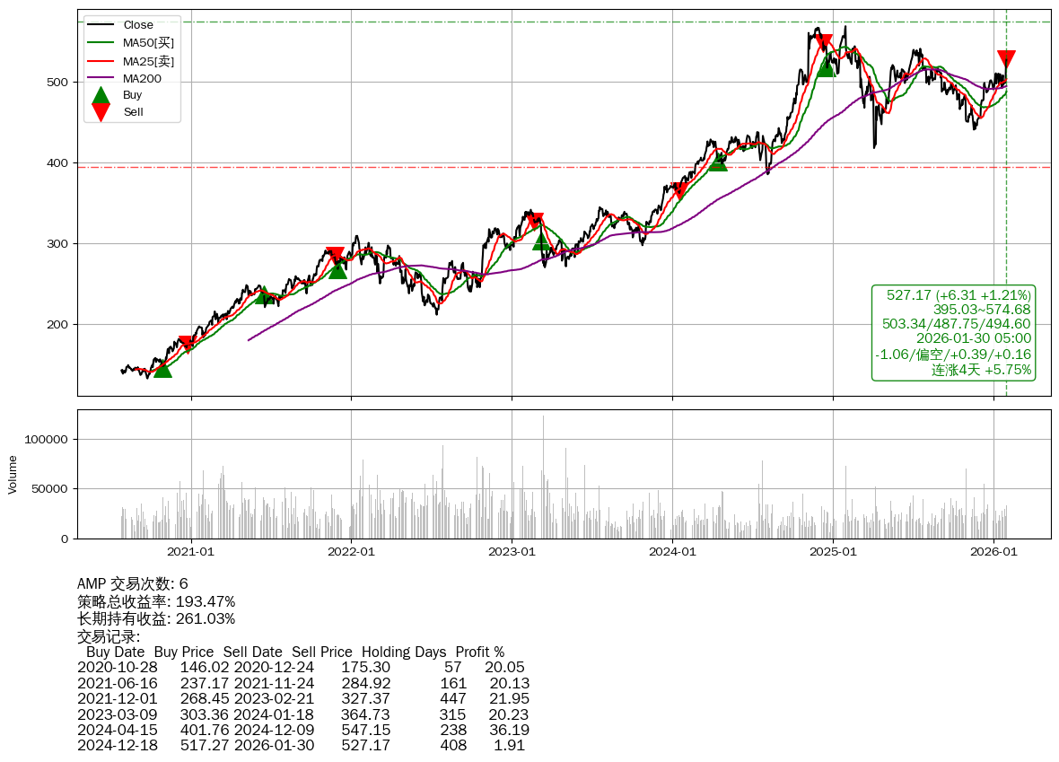 | 14 | AMP | $526.98(+5.99 +1.15%) 01-30 14:59 520.99 01-29 | 📈连涨4天 +5.75% 📉回撤 2025-01-29 -7.28% (365天) 568.56(2025-01-28)→417.92(2025-04-03) | +193.47% | +261.03% | -67.55% | 6 | 偏空/0.39/0.16 | 2020-07-27~2026-01-30 |