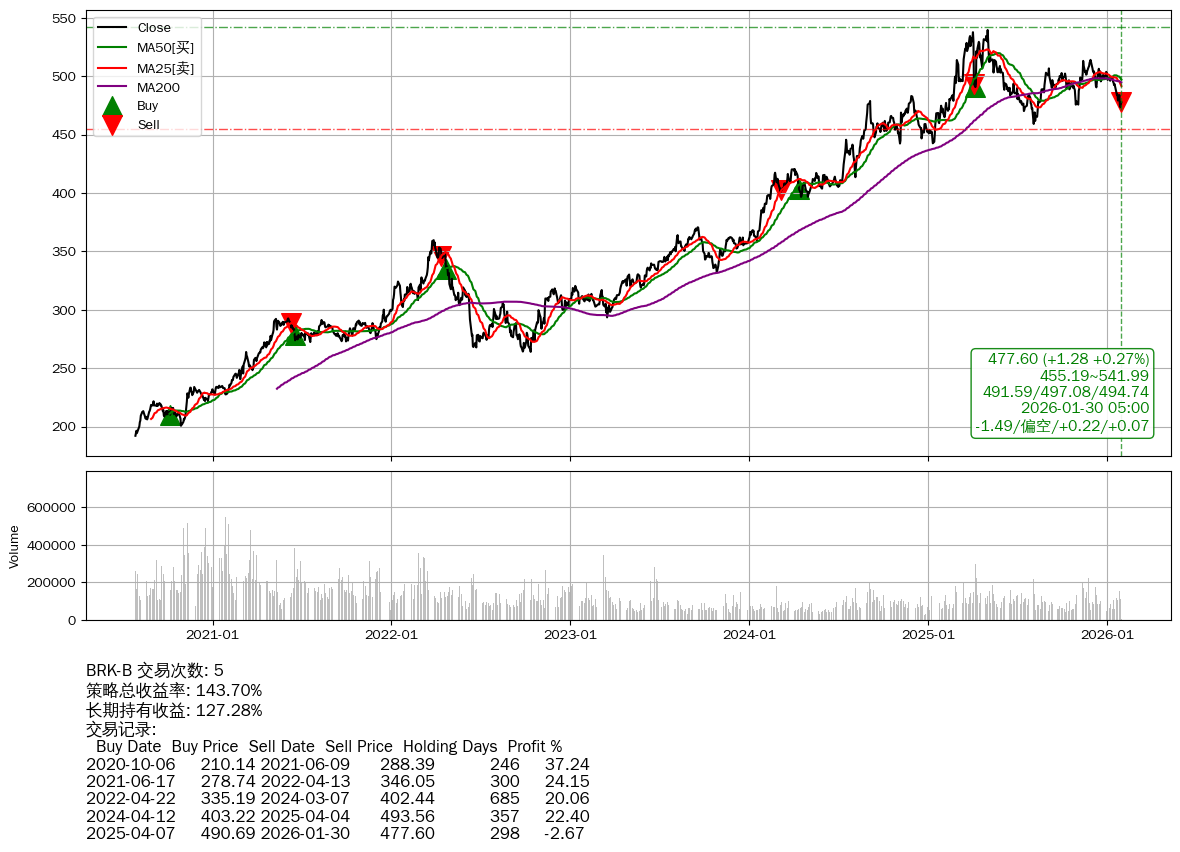 | 19 | ★BRK-B | $480.88(+4.68 +0.98%) 01-30 14:59 476.19 01-29 | 📈涨破 MA5 均线 📉回撤 2025-05-04 -11.48% (270天) 539.56(2025-05-01)→459.16(2025-08-03) | +143.70% | +127.28% | +16.42% | 5 | 偏空/0.23/0.07 | 2020-07-27~2026-01-30 |
