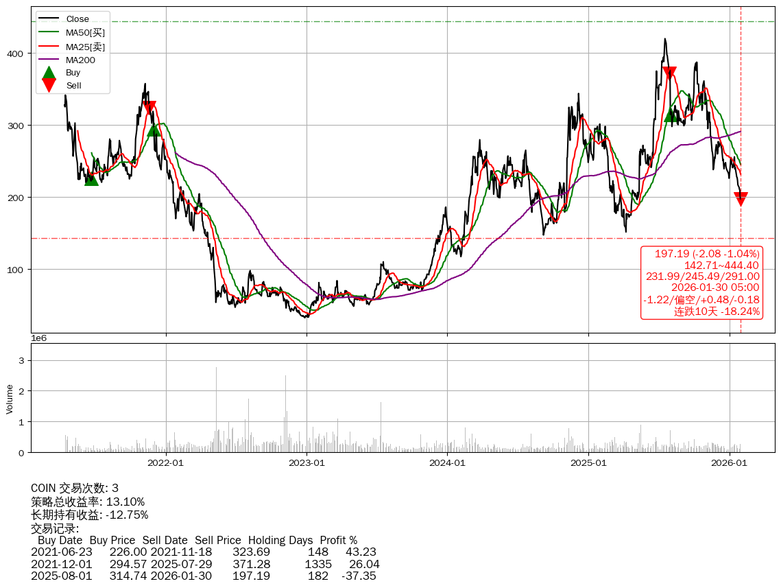 | 38 | ★COIN | $194.88(-4.37 -2.19%) 01-30 14:59 199.25 01-29 | 📉连跌10天 -18.24% 📉回撤 2025-07-20 -53.05% (193天) 419.98(2025-07-17)→197.19(01-29) | +13.10% | -12.75% | +25.85% | 3 | 偏空/0.49/-0.18 | 2021-04-14~2026-01-30 |