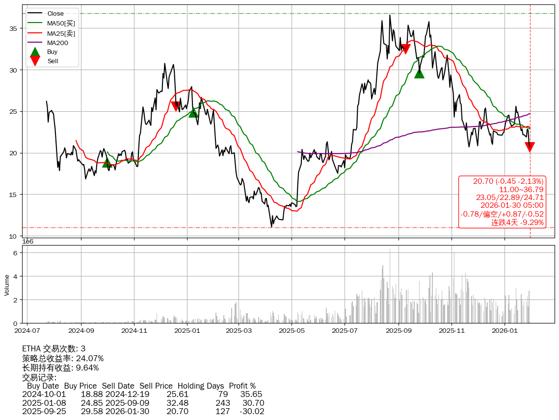 | 37 | ★ETHA | $20.21(-0.94 -4.44%) 01-30 14:59 21.15 01-29 | 📉连跌4天 -9.29% 📉回撤 2025-08-24 -43.41% (158天) 36.58(2025-08-21)→20.70(2025-11-20) | +24.07% | +9.64% | +14.43% | 3 | 偏空/0.87/-0.52 | 2024-07-23~2026-01-30 |