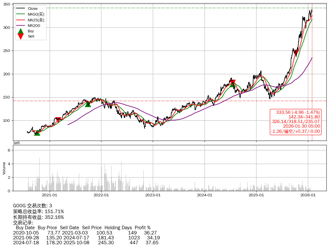 | 17 | ★GOOG | $338.64(+0.09 +0.03%) 01-30 14:59 338.55 01-29 | 📉跌破 MA5 均线 📉回撤 01-29 -1.47% (0天) 338.52(01-28)→333.56(01-29) | +151.71% | +352.16% | -200.45% | 3 | 偏空/0.36/-0.00 | 2020-07-27~2026-01-30 |