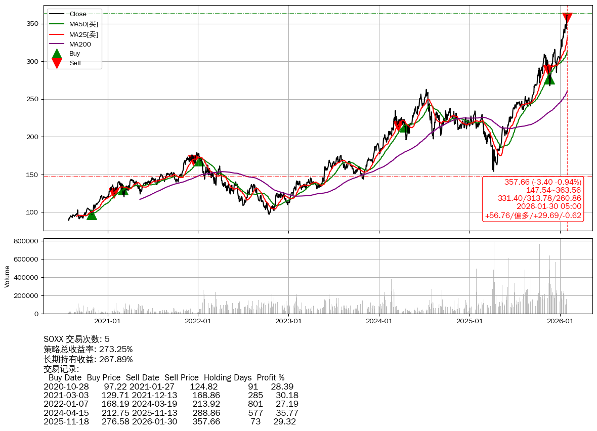 | 10 | ★SOXX | $346.26(-14.83 -4.11%) 01-30 14:59 361.10 01-29 | 📉回撤 01-29 -0.94% (0天) 361.06(01-28)→357.66(01-29) | +273.25% | +267.89% | +5.36% | 5 | 偏多/29.69/-0.62 | 2020-07-27~2026-01-30 |