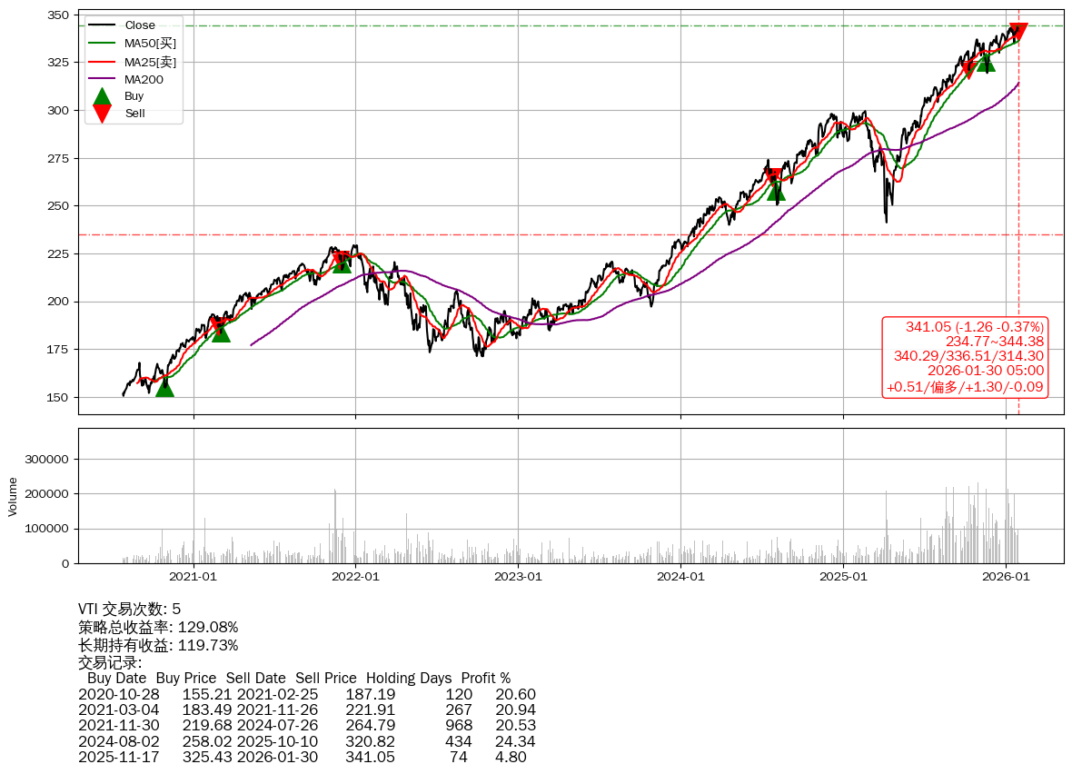 | 23 | ★VTI | $340.62(-1.58 -0.46%) 01-30 14:59 342.20 01-29 | 📉回撤 01-27 -0.64% (2天) 343.25(01-26)→341.05(01-29) | +129.08% | +119.73% | +9.34% | 5 | 偏多/1.3/-0.09 | 2020-07-27~2026-01-30 |
