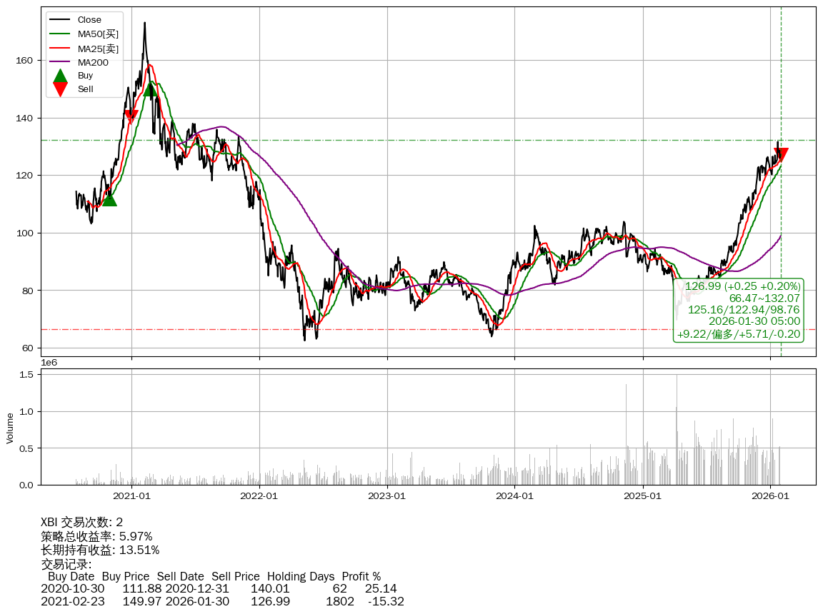 | 39 | ★XBI | $124.75(-2.00 -1.58%) 01-30 14:59 126.75 01-29 | 📉回撤 2021-02-08 -26.61% (1816天) 173.03(2021-02-07)→62.39(2022-05-10) | +5.97% | +13.51% | -7.54% | 2 | 偏多/5.67/-0.20 | 2020-07-27~2026-01-30 |